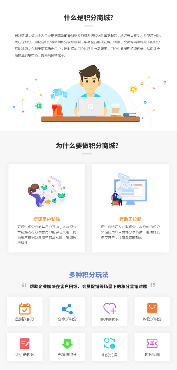 积分商城,致力于为企业提供成熟的会员积分商城系统和积分营销服务,通过每日签到、分享送积分关注送积分、购物送积分等多种积分获取机制,帮助企业解决在客户回馈、会员促销等场景下的积分营销难题,有利于商家稳定用户,同时增加用户的粘性与活跃度,用户生命周期持续延伸,从而让产品快速引爆市场,提高销售转化率。